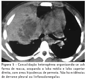 O achado de imagem mais freqüente, presente nos 7 pacientes, foi consolidação de contornos mal definidos (Figuras 1, 2, 3 e 4), sendo que 5 deles tinham broncograma aéreo de permeio, principalmente na periferia da lesão. Em 3 casos, a consolidação organizava-se sob forma de massa. Em 6 dos 7 pacientes foram observadas, no interior das consolidações, áreas irregulares de escavação, múltiplas em 5 e única em 1 paciente. Em um dos casos não se observou escavação, mas ele mostrava áreas hipodensas de permeio, sugestivas de necrose (Figura 5). Apenas um dos pacientes apresentou nível líquido no interior das cavidades.