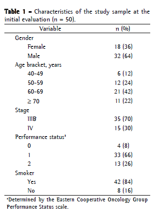 The initial exclusion criteria were as follows: having previously undergone lung surgery; and presenting with brain metastasis. During the study period, patients who presented with an ECOG PS score > 2 were excluded, in accordance with the treatment protocol of our facility, where chemotherapy is not given to such patients.(7) Therefore, the only exclusion criterion adopted during the follow-up visits was presenting with an elevated ECOG PS scale score (> 2).