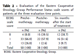 As can be seen in Table 2, the baseline (prechemotherapy) ECOG scale results for the 50 patients evaluated were as follows: a score of 0 (asymptomatic) in 4 (8%); a score of 1 (symptomatic) in 33 (66%); and a score of 2 (symptomatic and requiring treatment) in 13 (26%).