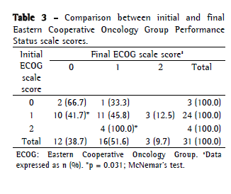 Table 3 shows the comparison between the initial PS and the final PS. Of the 31 patients who completed the six months of follow-up, 4 (12.9%) presented worsening of the PS, the ECOG scale score increasing from 1 to 2 in 3 patients and from 0 to 1 in 1. In addition, 13 (41.9%) of the 31 patients maintained their prechemotherapy PS (ECOG scale score: 0 in 2 patients; and 1 in 11 patients), whereas the PS improved in 18 (58.1%), the ECOG scale score decreasing from 1 to 0 in 14 (45.2%) and from 2 to 1 in 4 (12.9%).