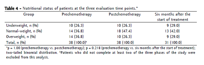 The statistical analyses were performed using the program Statistical Package for the Social Sciences, version 15.0 (SPSS Inc., Chicago, IL, USA). We determined the mean, standard deviation, and quartiles of the quantitative variables. In order to compare the prechemotherapy and postchemotherapy time points, we used the Wilcoxon test. In order to compare the three time points (prechemotherapy, postchemotherapy, and six months after the start of treatment), we used the Friedman test. In order to evaluate changes in the distribution of the patients among the weight groups at the different time points, we determined bilateral probability using binomial distribution.(15,16)
