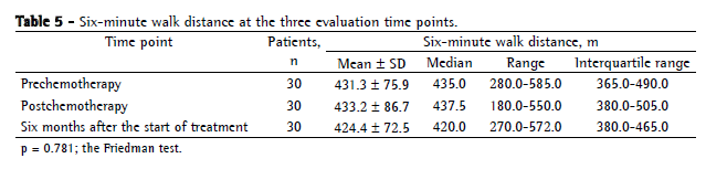 The prognostic value of the 6MWT in patients with NSCLC has been investigated, and the results have shown that the 6MWD decreases after the second cycle of chemotherapy and that a 6MWD ≥ 400 m can be a positive prognostic factor for these patients.(27) A recent study investigating patients with NSCLC who were evaluated before and one month after chemotherapy reported that there was no significant reduction in the 6MWD after the treatment,(26) a finding that was similar to those of the present study, in which there was no reduction in the 6MWD after chemotherapy or at six months after the start of treatment.
