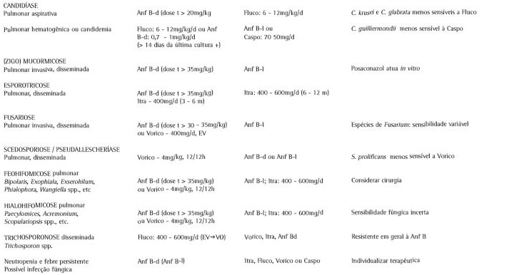 Itra: itraconazol; SMX-TMP: sulfametoxazol-trimetoprim; (g): seqüência de tratamento; Anf B-d: anfotericina B desoxicolato (convencional); dose t: dose total; Ceto: cetoconazol; Fluco: fluconazol; Vorico: voriconazol; Anf B-l: formulação lipídica de anfotericina B (lipossomal - L-Amb; em dispersão coloidal - ABCD; ou complexo lipídico - ABLC); Caspo: caspofungina.
