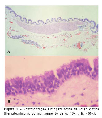 A representação histopatológica da lesão cística revelou revestimento interno por epitélio pseudoestratificado ciliado (do tipo respiratório) apoiado em estroma conjuntivo frouxo, permeado por feixes de células musculares lisas e glândulas mucosas na profundidade, semelhante aos constituintes normais da parede brônquica, exceto pela ausência de tecido cartilaginoso (Figura 3).