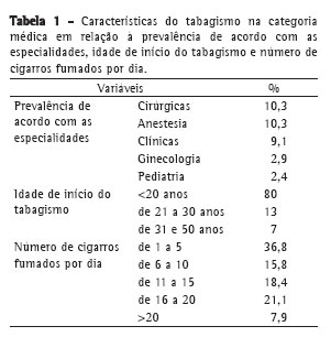 Em relação ao hábito tabágico de acordo com a faixa etária, verificou-se que 22,5% dos médicos situados na faixa etária de 31 a 60 anos eram tabagistas, em contraste com apenas 7,5% dos médicos que tinham menos de 30 anos e 5,1% dos que tinham mais de 61 anos, com diferença estatisticamente significativa (p < 0,05). Conforme as respostas, 80% iniciaram o hábito tabágico antes dos vinte anos de idade, 13% entre 21 e 30 anos e 7% entre 31 e 50 anos de idade (Tabela 1).