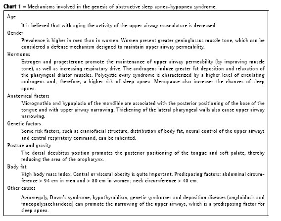 The physiopathology of obstructive sleep apnea syndrome is multifactorial. Gender and obesity status, as well as genetic, anatomic, and hormonal factors, together with ventilatory drive, interact in a diverse manner in the physiopathology and clinical expression of the disease. Obesity is the main risk factor, since increases in body mass index, visceral fat, and neck circumference are strong predictors of the disease. Progesterone increases the activity of the upper airway dilator muscles and therefore plays a protective role in premenopausal women. This explains the fact that the prevalence of the disease is higher in postmenopausal patients, in patients with polycystic ovary syndrome, as well as in males. Evidence supports the fact that, as individuals grow older, there is a decrease in muscle tonus, with a consequent reduction in the dimensions of the upper airway lumen. Craniofacial anomalies, such as in retrognathia or micrognathia, are accompanied by posterior positioning of the tongue and can result in narrowing of the upper airway lumen. Finally, decreased ventilatory drive has been detected in patients with obstructive sleep apnea syndrome and hypercapnia.