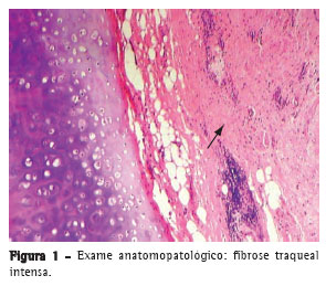 Uma paciente de 56 anos, não tabagista, branca, foi encaminhada com o diagnóstico de estenose de traquéia realizado por broncoscopia, e distúrbio ventilatório obstrutivo grave. Apresentava dispnéia progressiva havia seis anos, e tratamento de "bronquite" sem resultado. A tomografia cervical com reconstrução revelou estenose de 2 cm de extensão no final da laringe e traquéia e 60% de obstrução da luz traqueal (Figura 2). A dilatação não foi conseguida devido à intensa fibrose, tendo sido realizada a ressecção cirúrgica e traqueoplastia com anastomose término-terminal. O exame anatomopatológico revelou processo inflamatório crônico com proliferação vascular, sem outras anormalidades. Houve boa evolução pós-operatória, tendo sido a paciente acompanhada no ambulatório por um ano e três meses, apresentando-se assintomática nesse período.