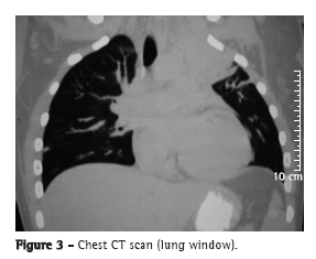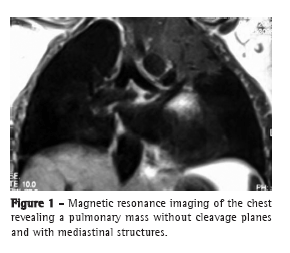 A 26-year-old female patient was hospitalized for the investigation of a tumor mass in the left upper lobe, with invasion of the mediastinum and chest wall. The patient presented with a 60-day history of chest pain that did not radiate and did not improve with the use of analgesics. The pain was accompanied by daily fever, dyspnea, worsening of overall health status, and productive cough with mucoid expectoration. She reported no weight loss or hemoptysis; nor did she report headache or other neurological symptoms.