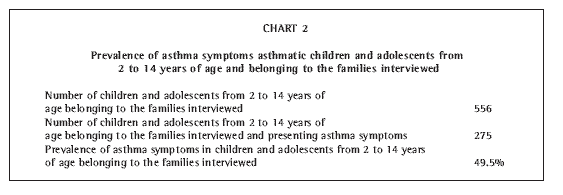 A total of 378 families were interviewed. In this survey, 244 families had children within the age group studied, and 174 of those had at least one child with asthma symptoms. These 244 families had a total of 556 children within the age bracket studied, 275 of whom presented asthma symptoms. These 556 children represented 40.3% of the 2- to 14-year-old population as estimated by the IBGE in the 1996 recount of the four census sectors. The prevalence of asthma symptoms in the sample was 49.5% (Chart 2).