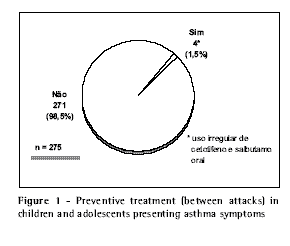 The guidelines establish norms and standardize asthma management through resources such as proper treatment of attacks, continued use of medication and education toward health(17). In our study, it was evident that, within this population group, these objectives have not yet been achieved, since only 1.5% of the patients sought treatment in the period between attacks, and then inconsistently, without significant difference between the two age brackets studied.