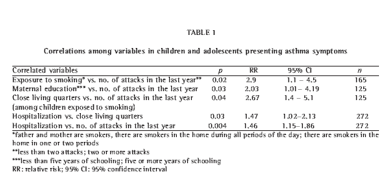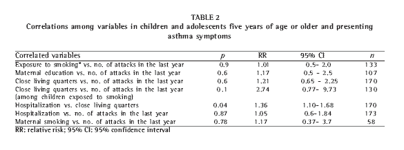 We also found a correlation between exposure to smoking in the home during two or more periods of the day and a history of more than two attacks during the last year. However, when this relationship was analyzed regarding close living quarters, it was observed that when there were three or more people in the bedroom with the child the correlation between periods and attacks persisted, whereas when there were less than three people in the bedroom with the child this correlation was not observed.