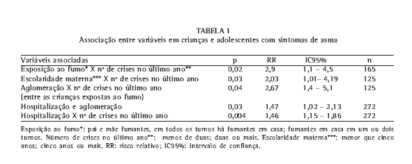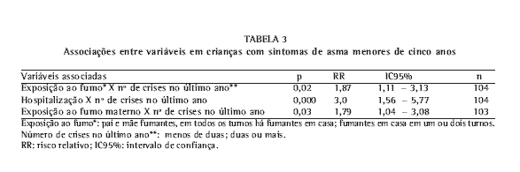 Houve também associação, nos menores de cinco anos, entre exposição ao fumo e número de crises no último ano, com quase o dobro de risco. Também a hospitalização esteve associada a mais crises no último ano. Nesse grupo etário, somente a presença da mãe fumante já apresentou associação com mais crises de asma.