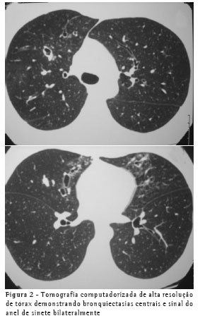 A avaliação clínica revelou roncos e sibilos difusos bilaterais. Os exames subsidiários mostraram: espirometria normal, teste alérgico cutâneo imediato (Prick teste) positivo para A. fumigatus, hemograma com eosinofilia (13%), IgE sérica total maior que 1.000 ng/ml, teste sérico para determinação de IgE específica (RAST) para A. fumigatus classe 3. Na radiografia simples de tórax observaram-se imagens de opacidade em "dedo de luva" no terço superior direito (Figura 1) e na tomografia computadorizada de alta resolução, bronquiectasias centrais (Figura 2).