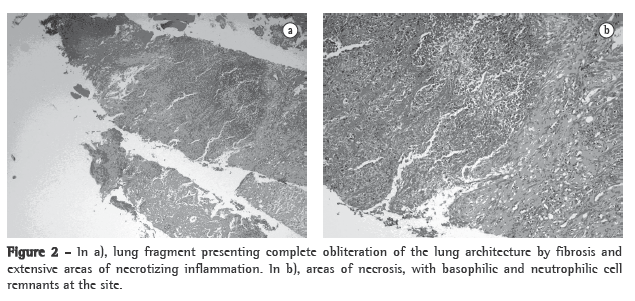Case reportA 61-year-old male patient sought treatment at the pulmonology outpatient clinic reporting lung secretion with occasional bloody sputum for approximately 5 months. Within the past month, the patient had severe cough, dyspnea and a peak of fever. The patient reported no other respiratory problems and no history of occupational risk. He also reported long-term labyrinthitis and recent hypoacusis. He was a former smoker (30 pack-years) who had not smoked for 10 years. The physical examination revealed that the patient was well hydrated and with good color. He presented abnormal breath sounds, crackles in the right hemithorax base, increased vocal fremitus and a systemic arterial pressure of 120/80 mmHg. The SpO2 was 96%. The investigation began with imaging studies and laboratory tests. A chest X-ray showed a nodular opacity in the lower third of the right hemithorax (Figure 1a), a sinus X-ray revealed thickening of the left maxillary sinus mucosa, and a CT scan of the chest revealed an extensive lesion in the right hemithorax (4.2 cm × 3.1 cm), contiguous with the parietal pleura (Figure 1b). Based on these findings, we requested a tomography-guided percutaneous biopsy, which showed areas of fibrosis and areas of extensive necrosis associated with an inflammatory process (Figures 2a and 2b), whose possible causes include WG, bronchocentric granulomatosis or an infectious disease.
