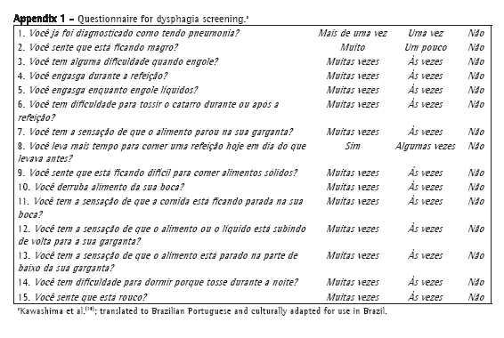 For the identification of symptoms of dysphagia, we adopted an international questionnaire that was translated to Brazilian Portuguese and culturally adapted for use in Brazil by the authors of the present study.