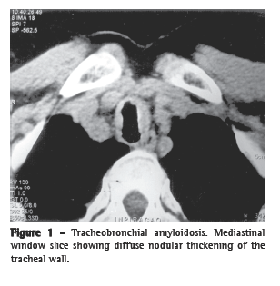 Amyloidosis is characterized by local or systemic deposition of abnormal amyloid material in extracellular tissues and can involve multiple organs, such as the heart, the kidneys, and the gastrointestinal tract.(3-5) Primary respiratory amyloidosis presents three characteristic forms: nodular, diffuse parenchymal, and tracheobronchial.(3-6) The most common is the tracheobronchial form. The most common symptoms are cough, dyspnea, hemoptysis, and hoarseness.(4) The predominant radiographic finding is nodular, irregular narrowing of the trachea. Computed tomography scans can reveal nodules protruding into the tracheal lumen or, more often, diffuse parietal thickening, with multifocal submucosal plaques(5,7) (Figure 1). In contrast to what is seen in tracheobronchopathia osteochondroplastica, the posterior wall of the trachea can be affected. The thickened wall can present calcifications.(6,7) Parenchymal abnormalities secondary to obstruction caused by bronchial collapse can be seen, as can recurrent infectious consolidations, bronchiectasis, and obstructive hyperinflation.(3,7)