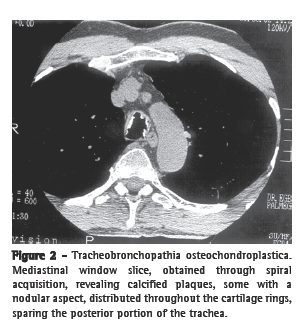 Tracheobronchopathia osteochondroplastica is a benign disease of the tracheobronchial tree, of unknown etiology, characterized by the presence of multiple submucosal osteocartilaginous nodules, which are primarily located in the anterior and lateral walls of the trachea and in the main bronchi. The posterior wall of the trachea is rarely affected.(1,8-12) Many patients are asymptomatic, and the disease, in such cases, is diagnosed through routine tests.(3) The most common symptoms are cough, dyspnea, wheezing, and, occasionally, hemoptysis, which is caused by the friction between nodules.(9) Patients frequently present recurrent respiratory infections.(8,9) Although tracheobronchopathia osteochondroplastica is a benign disease, it can evolve to severe tracheal stenosis.(1,9) Computed tomography is very sensitive in the identification of nodule calcification, in the definition of the extent and distribution of the tracheobronchial stenosis, and in the characterization of complications, such as atelectasis, bronchiectasis, and postobstructive pneumonia.(10) As can be seen in Figure 2, the most common tomographic finding is the presence of multiple submucosal nodules, calcified or not, located in the anterior and lateral walls of the trachea.(1,3,9-12)