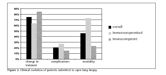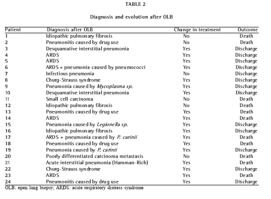 Method: We reviewed, retrospectively, the charts of 24 patients, ranging from 26 to 89 years of age, admitted to the intensive care units of two private hospitals and submitted to open lung biopsy.