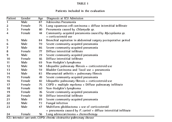 Two patients presented more than one diagnosis: one presented acute respiratory distress syndrome (ARDS) accompanied by pneumococcal pneumonia, whereas the other presented ARDS accompanied by pneumonia caused by Pneumocystis carinii.