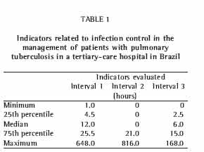 The criteria used for the reporting and investigation of cases were those established by the Brazilian Health Ministry(8). Bacillary load was evaluated based on the result of the sputum microscopy for AFB (performed using the Ziehl-Neelsen method) and was considered high if +++ or ++++ and low if + or ++. Based on data from the case report forms, chest X-rays were classified as "suspect" (infiltrate in any location, cavitations, and pleural effusion or pneumothorax), "normal" or "presenting other alterations". Respiratory patients who presented cough for more than three weeks were categorized as symptomatic. The indicators evaluated were those defined by the Centers for Diseases Control and Prevention, 1994(3). Three indicators were defined: Interval 1 - interval between admission and collection of sputum for smear microscopy (for AFB), Interval 2 - interval between admission and implementation of airborne infection control measures, and Interval 3 - interval between collection of sputum for smear microscopy (for AFB) and the initiation of treatment.