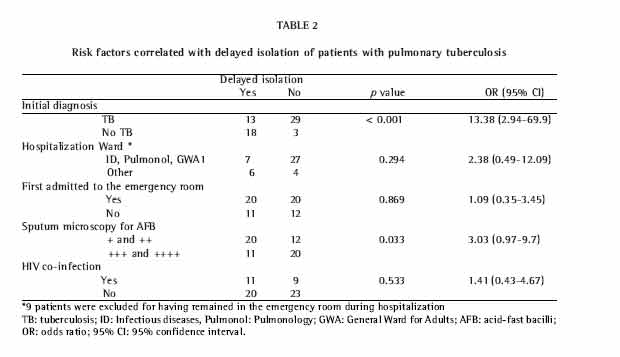 Delay in the implementation of airborne infection control measures, evaluated through Interval 2, occurred in 31 cases (49.2%). There was no statistically significant difference in the occurrence of delay among the various years evaluated (p = 0.467). Thirteen patients (9 in the emergency room and 4 in the wards) were not isolated at any time. In these cases, the result of the sputum microscopy for AFB was not known until after patient discharge or death. No clinical suspicion of TB at admission, as well as lower bacillary load in the sputum, was found to correlate with delay in the implementation of airborne infection control measures (Table 2).