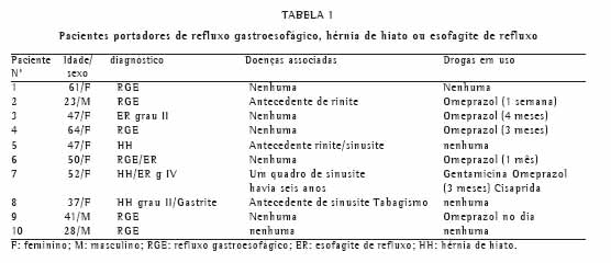 Das 21 provas de broncoprovocação realizadas, 17 foram feitas em mulheres e 4 em homens; 10 foram em pacientes portadores de RGE ou de esofagite de refluxo ou de hérnia de hiato, como mostram as Tabelas 1 e 2. Observamos que destes pacientes, 6 apresentavam RGE, 3 esofagite de refluxo, e 3 apresentavam hérnia hiatal (todos diagnosticados por endoscopia digestiva). Seis pacientes estavam em uso de bloqueador de bom-ba de prótons para tratamento destas doenças. Dois pacientes apresentavam história de rinite tratada e 5 dos 10 pacientes reagiram positivamente ao teste de broncoprovocação (queda de VEF1 > 20%).