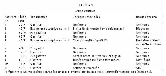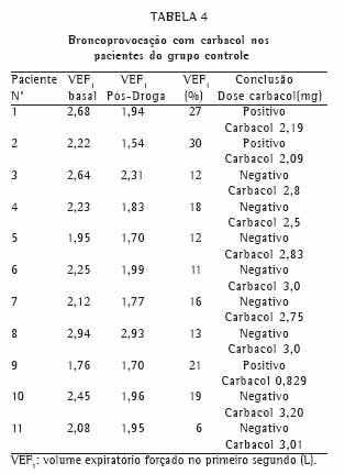 No grupo controle, 9 pacientes eram portadores de gastrite e os outros possuíam exame endos-cópico dentro dos padrões da normalidade. Três deles apresentaram teste de broncoprovocação positivo. Dois tinham história de rinite tratada, sen-do que 1 deles era ex-tabagista, 1 era portador de artrite reumatóide e 2 tinham hipertensão arterial sistêmica, sendo que 1 deles era tabagista (o teste foi realizado depois de informar que era tabagista) e o outro apresentou pneumonia três meses antes do teste (Tabelas 3 e 4).