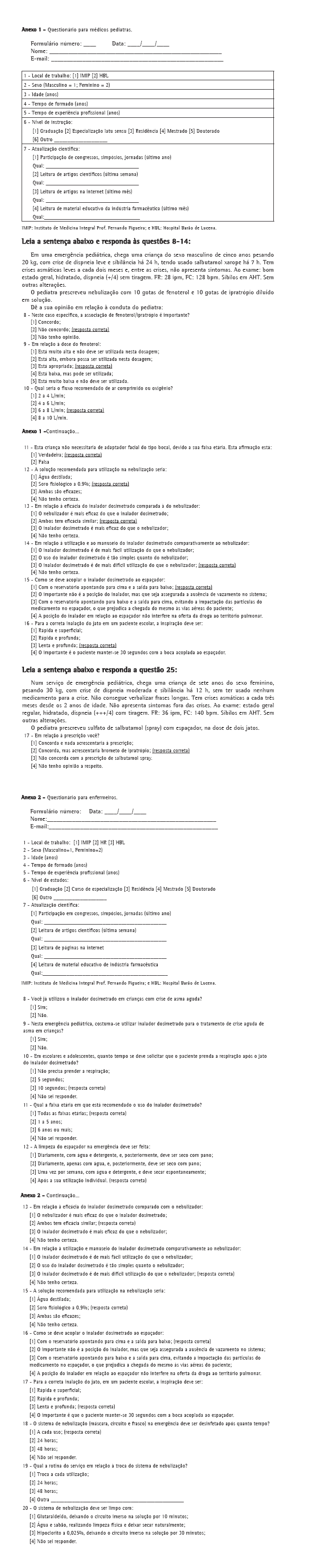 O objetivo do presente estudo foi avaliar o conhecimento de profissionais da área de saúde - médicos pediatras e enfermeiros que trabalham em hospitais de atendimento de urgência - quanto ao manejo da crise aguda de asma.
