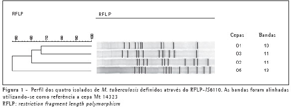 Os quatro isolados do complexo M. tuberculosis apresentaram perfis genéticos únicos, ou seja, totalmente distintos uns dos outros. Nenhum grupo genético, identificado por amostras que compartilham o mesmo perfil de bandas, foi observado. Estes dados são reforçados pela ausência de correlação epidemiológica também verificada através da análise de prontuários médicos. Os resultados da correlação são apresentados na Tabela 1.
