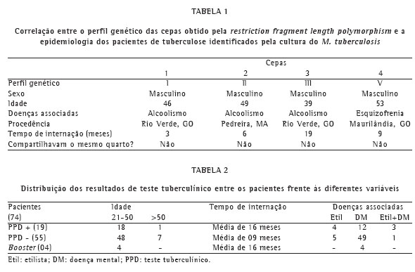 Objective: To investigate the prevalence of infection, disease and eventual institutional outbreak of tuberculosis in a psychiatric hospital using the PPD test, as well as testing for mycobacteria in material collected from the respiratory tree and using molecular tracking technique based on insertion sequence 6110 (IS6110). Methods: Between February and August of 2002, PPD tests were given to 74 inpatients and 31 staff members at a psychiatric hospital in the city of Rio Verde, located in the state of Goiás, Brazil. In addition, respiratory tree material collected from the inpatients was submitted to testing for Mycobacterium tuberculosis. Results: Among the patients analyzed, mycobacteria were isolated from five (6.8%): four identified as M. tuberculosis and one as M. chelonae. The M. tuberculosis isolates were sensitive to isoniazid and rifampicin, and, when submitted to the restriction fragment length polymorphism/IS6110 technique, presented unique genetic profiles, totally distinct from one another, suggesting that all of the tuberculosis cases were due to endogenous reactivation. It was not possible to characterize this group of cases as an institutional outbreak. Performing the two-step tuberculin test in the patients, the infection rates were 23% and 31%, compared with 42% among staff members, who were submitted to the one-step test. Conclusion: The results indicate a high incidence of tuberculosis infection among inpatients and hospital staff, as well as a high occurrence of the disease among inpatients.