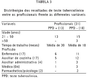 Este dado pode justificar o nosso achado de as taxas de tuberculina positiva serem semelhantes entre o corpo de enfermagem e o pessoal da cozinha do hospital analisado (Tabela 3). Em outro estudo,(24) encontrou-se prevalência de infecção por M. tuberculosis de 51% entre os profissionais de saúde de uma instituição hospitalar universitária na cidade do Rio de Janeiro (RJ). Mesmo entre estudantes de Medicina, alguns autores(25) verificaram taxas crescentes de positividade de 4%, 6,4% e 13%, de acordo com o progredir das atividades práticas, aumento também indicado por outros autores(26) entre funcionários de uma referência ambulatorial para TB na cidade de São Paulo.