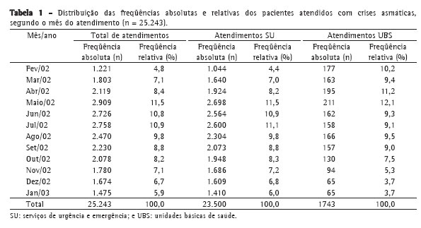 Objetivo: Avaliar a prevalência dos atendimentos por crises de asma nos serviços públicos de Juiz de Fora (MG), no período de 01/02/2002 a 31/01/2003. Métodos: Realizou-se estudo seccional, mensalmente, valiando-se os atendimentos por crises de asma. As variáveis analisadas foram sexo, idade, local de residência dos pacientes, diferenças no perfil os atendimentos segundo a faixa etária e o local de atendimento, além da correlação das crises asmáticas com temperatura e umidade relativa do ar. Resultados: Foram atendidos 25.243 pacientes com crises asmáticas, representando 11,1% do total de consultas da clínica pediátrica e 2,7% do total de consultas da clínica médica. A média de idade dos pacientes foi de 11,6 anos e a mediana de quatro anos. Eram do sexo masculino 52,9% dos pacientes. A análise da distribuição anual evidenciou um aumento do número de atendimentos por crises asmáticas nos meses e maio (11,5%), junho (10,8%) e julho (10,9%), com correlação inversa e forte para temperatura (-0,86) e inversa e fraca para umidade relativa (-0,27). Houve diferença estatisticamente significativa entre as médias de idade e sexo, quando se compararam os serviços de urgência e as unidades básicas de saúde. A avaliação segundo a faixa etária demonstrou predomínio do sexo masculino nos pacientes menores de doze anos e do feminino nos maiores ou com doze anos. Conclusão: observou-se a importância da asma como problema de saúde pública no município, o qual necessita de estratégias locais urgentes que permitam aumentar os investimentos em tratamentos profiláticos.