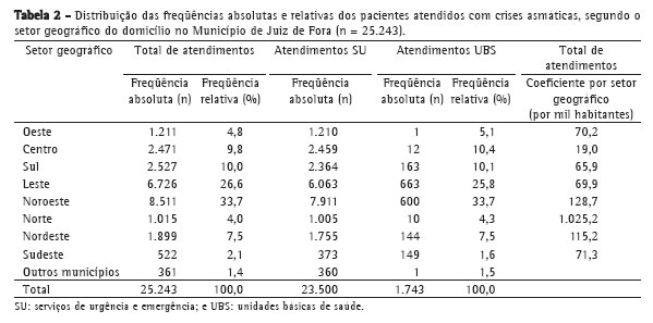 Na avaliação da distribuição dos pacientes por local de moradia, demonstramos maior freqüência de atendimentos por crises de asma em pacientes que residiam nas regiões Leste e Noroeste, o que pode ser justificado pelo fato de serem duas regiões de grande adensamento populacional. No entanto, a análise do coeficiente por setor geográfico evidenciou um maior número de atendimentos por crises de asma por mil habitantes nos setores Nordeste, Noroeste e Norte, provavelmente por serem estas populações de mais baixas condições socioeconômicas, segundo o Instituto Brasileiro de Geografia e Estatística, e com maior dependência do SUS.
