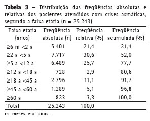 Comparando-se os atendimentos por asma nos serviços de urgência e nas UBS, verifica-se que houve diferença significativa entre as médias das idades dos pacientes (p = 0,000001, pelo teste de Mann-Whitney), sendo a média de idade maior nas UBS, bem como na distribuição dos atendimentos pelo sexo, em que observamos predomínio para o sexo masculino nos serviços de urgência (p = 0,004, odds ratio = 1,15, com intervalo de confiança de 95% de 1,04 a 1,27 e RP (Razão de Prevalência)= 1,07 com intervalo de confiança de 95% de 1,02 a 1,13, pelo teste do Qui-quadrado).Os pacientes foram distribuídos em sete faixas etárias, sendo que 77,7% (19.607) dos pacientes tinham menos de doze anos (Tabela 3).