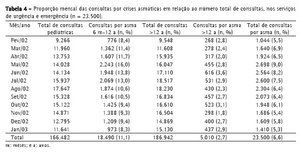 A proporção das consultas por crises asmáticas, nos serviços de urgência e emergência, em relação ao número total de consultas para a faixa etária de seis meses a doze anos, variou, nos doze meses de coleta, de 8,3 a 16%; para a faixa etária maior ou igual a doze anos a variação foi de 1,8 a 3,6%, enquanto que para todas as faixas etárias, pudemos observar variação de 5,3 a 9%. Em relação ao total de atendimentos na faixa etária menor de doze anos, os atendimentos por asma representaram 11,1%; na faixa etária maior ou igual a doze anos, representaram 2,7%, e para todas as faixas etárias, 6,6% (Tabela 4).