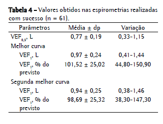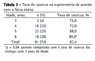 Além disso, somente 4 crianças em nossa amostra pertenciam ao grupo etário que apresenta o maior risco de insucesso (≤ 3 anos de idade). Por outro lado, esse fato não invalida os resultados da amostra como um todo, tendo-se evidenciado um elevado índice de sucesso da espirometria quando realizada por um profissional treinado e habilitado.
