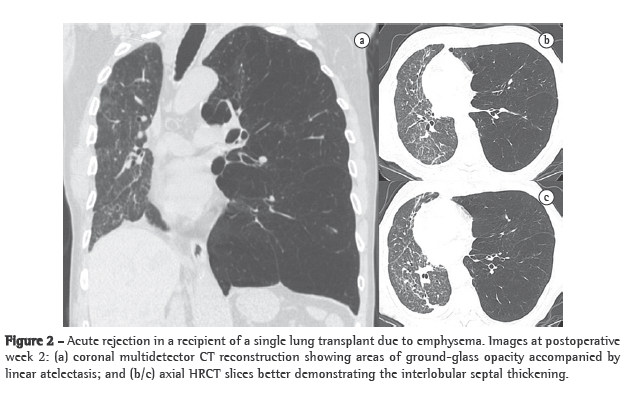 Acute rejection after transplantation is a common occurrence. Nearly 95% of patients present at least two episodes within the first month after surgery. Histologically, acute rejection is characterized by predominantly lymphocytic perivascular infiltrate, with or without bronchiolar involvement.(8) Symptoms are generally nonspecific, including low-grade fever, breathlessness and fatigue. Most patients experience at least one episode of acute rejection within the first 3 weeks and remain at high risk for this complication for the first 100 days after transplantation.(5) Chest X-ray findings are normal in up to 50% of cases.(6) The most common findings are perihilar and lower-lobe opacities, as well as interlobular septal thickening and pleural effusion (Figure 2).(9) The HRCT features are relatively nonspecific and include ground-glass opacities (often with basal distribution), peribronchial cuffing, septal thickening (interlobular and intralobular) and new or more extensive pleural effusion.(10) This complication can be almost completely excluded if there are no ground-glass opacities.(9) Acute rejection is treated with intravenous corticosteroids and typically responds quite well after 24 h of this treatment. A dramatic reduction in abnormal radiological features after 48 h of intravenous administration of methylprednisolone is indicative of a diagnosis of acute rejection.(9,10)