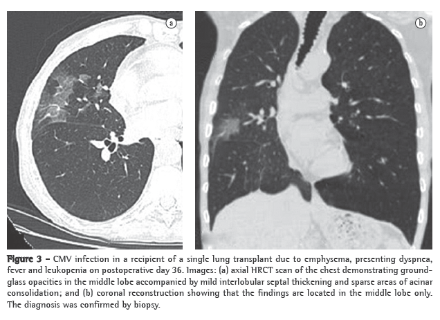 Opportunistic infection occurs in 34-59% of lung transplant recipients.(13) Unfortunately, in patients with new opportunistic pneumonia, chest X-ray findings can be normal, and abnormal findings, when present, are often nonspecific.(11) Cytomegalovirus (CMV) is the most common opportunistic infection among such patients.(14) The incidence of CMV infection peaks between 1 and 2 months after transplantation, most cases occurring between postoperative months 1 and 12.(11,14) Infection with CMV can be primary and secondary. Primary infection occurs in over 90% of CMV seronegative patients receiving a CMV seropositive donor lung and becomes severe in 50-60% of such cases.(11) Secondary infection results from exposure to a different CMV strain or from reactivation of a latent infection in the recipient and is usually less severe than is primary infection.(11) Clinical manifestations of CMV infection include dyspnea, fever, malaise and leukopenia, although many patients with histologically proven CMV pneumonia are asymptomatic.(15) A diagnosis of CMV pneumonia is typically confirmed only after bronchoalveolar lavage and transbronchial biopsy. The radiologic ­manifestations of CMV pneumonia include, as shown in Figure 3, ground-glass opacities, interlobular septal thickening and consolidation, as well as diffuse reticular or reticulonodular opacities, nodules and small areas of effusion.(14) In lung transplant recipients with active CMV infection, chest X-ray findings can be normal,(11) CT scans better depicting the radiological manifestations of the infection, which almost exclusively affects the allograft. The most common CT manifestations are ground-glass opacities, tree-in-bud opacities, airspace consolidation, nodules, interlobular septal thickening, pleural effusions, thickened/enlarged pleura and bronchiectasis.(11-15) Other common viral pulmonary pathogens affecting this population include herpes simplex virus, adenovirus and respiratory syncytial virus.(11)