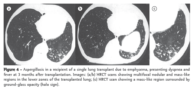 In lung transplant recipients, fungal pneumonia, which is typically caused by Aspergillus spp. or Candida spp., is less common than is CMV pneumonia but is associated with higher mortality.(11,16,17) Fungal pneumonia most often occurs within the first 2 months after transplantation.(11) Infection with Aspergillus spp. can present either as an indolent pneumonia or as a fulminant invasive infection with systemic dissemination.(16,17) Aspergillus infection can also cause ulcerative tracheobronchitis that is often radiographically occult and can lead to anastomotic dehiscence.(11,17) Although Candida spp. frequently colonize the airways, invasive ­pulmonary infection is rare.(11) Fungal anastomotic infection or pneumonia is suspected on the basis of positive smears/cultures of bronchoalveolar lavage samples. However, since these organisms can colonize the donor lung, definitive diagnosis of invasive fungal infection might require transbronchial biopsy.(11) Typical features on HRCT images include the following: focal nodular and mass-like regions of consolidation; cavitation; nodules (solitary or multiple) with a surrounding rim of ground-glass opacity, referred to as the "halo" sign (Figure 4); and pleural thickening.(16,17)
