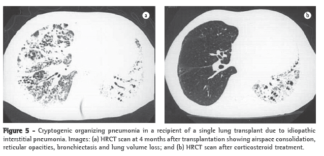 The prevalence of cryptogenic organizing pneumonia among lung transplant recipients is 10-28%.(19) This clinicopathologic syndrome-characterized clinically by subacute or chronic respiratory illness and pathologically by polypoid masses of granulation tissue in the lumen of small airways, alveolar ducts, and some alveoli-is associated with a variable degree of interstitial and airspace infiltration by mononuclear cells and foamy macrophages.(19) An HRCT scan often reveals airspace consolidation, ground-glass opacities, nodular or mass-like consolidation and linear or reticular opacities (Figure 5). Additional findings include bronchiectasis, bronchiolectasis, fibrosis, lung volume loss and air trapping.(19)