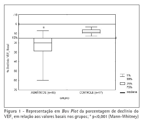 Dos 45 asmáticos, 36 tiveram PB positiva com queda média de VEF1 de 27,4% (amplitude de 15% a 60%), com variação da média de + 4% (intervalo de confiança de 95%) após inalação de SH. Destes 36 asmáticos, 26 ainda apresentaram PB positiva (72%) quando se considerou o valor de declínio do VEF1 de 20%. Nove indivíduos tiveram a PB negativa, com redução máxima do VEF1 de 14% (média de 9%, amplitude de 7% a 14%), com variação da média de + 1,7% (intervalo de confiança de 95%) no tempo máximo de inalação de 15,5 minutos. No grupo controle, a redução máxima do VEF1 após a inalação da SH no tempo máximo de 15,5 minutos foi de 13% (média de 8,5%, amplitude de 3% a 13%), com variação da média de + 1% (intervalo de confiança de 95%). As diferentes respostas à PB com SH observadas no grupo de pacientes asmáticos e no grupo controle foram estatisticamente significativas (p < 0,05) (Figura 1). Todos os participantes apresentaram tosse ao início da inalação e sialorréia durante o teste, mas na progressão do experimento havia adaptação por parte dos mesmos e os sintomas desapareciam.