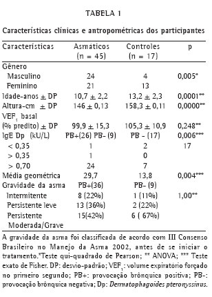 Foram submetidos ao protocolo 85 crianças e adolescentes, 45 no grupo de asmáticos e 17 no grupo controle, que completaram o teste (Tabela 1). Foram excluídos 23 indivíduos, 9 por apresentarem altos níveis séricos de anticorpos IgE específicos ao Dp, 6 por intolerância ao sal, 5 por falta de reprodutibilidade das manobras expiratórias e 3 por apresentarem VEF1 basal abaixo de 75%.