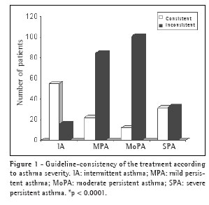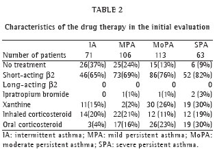 The treatment was then classified as consistent or inconsistent with the guidelines established in the III Brazilian Consensus on Asthma Management(20): intermittent asthma - use of a short-acting b2 agonist alone; mild persistent asthma - use of low doses of an inhaled corticosteroid (400 g/day of beclomethasone or equivalent) or antileukotriene; moderate persistent asthma - use of low or moderate doses of an inhaled corticosteroid (ranging from 400 to 800 g/day of beclomethasone or equivalent), in combination with a long-acting b2 agonist or high doses of an inhaled corticosteroid (> 800 g/day of beclomethasone or equivalent); severe persistent asthma - use of high doses of an inhaled corticosteroid, a long-acting b2 agonist, an oral corticosteroid, theophylline, or antileukotriene drugs.