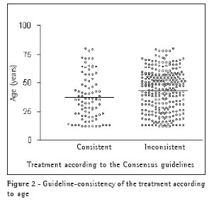 The frequency of guideline-consistent treatments was found to be the highest among the youngest patients (those between 12 and 18 years of age) and among those presenting normal FEV1 in the initial spirometric test (p < 0.01). The treatments received by the patients at the moment of the initial evaluation are described in Table 2. In addition, we observed a higher prevalence of intermittent asthma and mild persistent asthma among the young patients (p = 0.01). Figure 2 shows the age distribution in the groups of patients receiving guideline-consistent and guideline-inconsistent treatment.