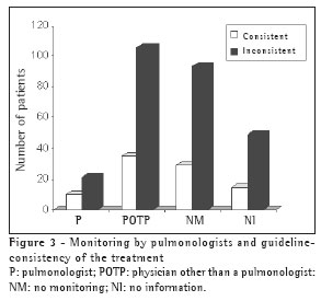 There was a slight tendency, with no statistical significance, toward a greater number of guideline-inconsistent treatments among the patients previously treated by non-pulmonologists (Figure 3). The treatment was considered guideline-inconsistent in 21/31 cases being treated by pulmonologists (68%), in 105/140 cases being treated by any other physicians other than pulmonologists (75%), and in 93/122 cases of patients not in follow-treatment (76%). In 64 cases, it was not possible to categorize the treatment based on the information contained in the medical charts.