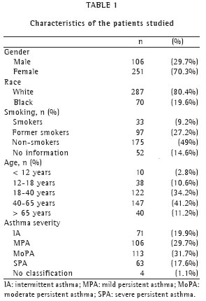 The diagnostic criteria were as follows: presenting symptoms (dyspnea, chronic cough, or wheezing); having obstructive ventilatory disorder, which was defined as forced expiratory volume in one second (FEV1) < 80% of predicted and ratio between FEV1 and forced vital capacity < 0.7. Patients meeting these criteria in the initial evaluation or during the follow-up treatment were classified as asthma sufferers. Patients presenting chronic obstructive pulmonary disease, bronchiectasis, tuberculosis sequelae, or any other chronic pulmonary disease were excluded. The medications that the patients themselves reported taking in the final evaluation were considered to constitute the treatment regimen at the moment of the first medical appointment, and this treatment regimen was compared with that recommended in the guidelines established in the III Brazilian Consensus on Asthma Management. Patients having had no medical appointments within the last twelve months were not considered to be in follow-up treatment.