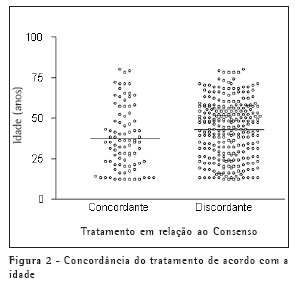 Ocorreu maior freqüência de tratamentos concordantes com o Consenso entre os mais jovens (idades entre doze e dezoito anos) e naqueles com volume expiratório forçado no primeiro segundo normal na espirometria inicial (p < 0,01). Os tratamentos recebidos pelos pacientes no momento da avaliação inicial estão descritos na Tabela 2. Adicionalmente, observamos uma maior prevalência de asma intermitente e asma persistente leve entre os jovens (p = 0,01). A Figura 2 mostra a distribuição etária nos grupos de pacientes com tratamento concordante e discordante.