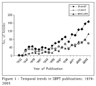 Only articles were included in the survey. Therefore, theses, book chapters, books and technical texts were excluded. A total of 1502 publications were identified: 752 from Medline; and 750 from LILACS. The number of publications per year (Figure 1) reveals an approximate 80-fold increase in the number of publications from 1979 to 2005, compared with a two-fold increase in the number of abstracts published in the Annals of the Brazilian Pulmonology and Phthisiology conferences for the 1986 to 2004 period, as cited in the article by Yoo, Fabro and Queluz.(3)