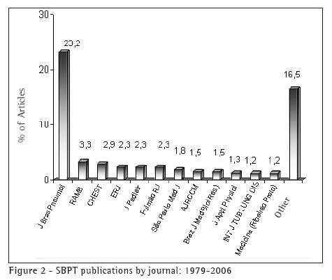 With respect to the most frequently used journals for these publications, one finds the JBP (formerly the Jornal de Pneumologia Brasileira, Journal of Brazilian Pulmonology) with the highest percentage of publications (23.2%), followed by percentages ranging from 3.3% to 1.2% for the other journals of the area (Figure 2). The higher impact international journals, such as Chest, European Respiratory Journal (ERJ) and the American