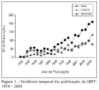 Com o intuito de avaliar a tendência temporal da pesquisa, na área da Pneumologia do país, realizou-se uma busca bibliográfica por nomes de autores (pneumologistas membros da Sociedade Brasileira de Pneumologia e Tisiologia - SBPT), de 1979 a 2006, em duas das maiores bases de dados de publicações internacionais e da América Latina: MEDLINE e LILACS. Não se pretendeu com esta pesquisa abranger toda a Pneumologia brasileira, pois se sabe que há pneumologistas que não pertencem ao quadro de sócios da SBPT, assim como há publicações na área da Pneumologia de autores não sócios da SBPT. Acredita-se, contudo, que uma busca de cerca de 2.400 nomes pertencentes à SBPT reflita de uma maneira global a produção científica da área no país e internacionalmente. Para não haver duplicação na busca e para restringi-la apenas à área da Pneumologia, adotaram-se algumas estratégias: publicações encontradas nas duas bases de dados pesquisadas foram incluídas apenas no MEDLINE, já que as revistas indexadas nesta base de dados têm maior índice de impacto do que aquelas encontradas na LILACS; publicações de vários autores sócios da SBPT contaram apenas como uma publicação em nome do primeiro autor; publicações de autores sócios da SBPT, mas não referentes à área de Pneumologia, foram excluídas dos resultados; as instituições de origem consideradas foram aquelas do primeiro autor do manuscrito.